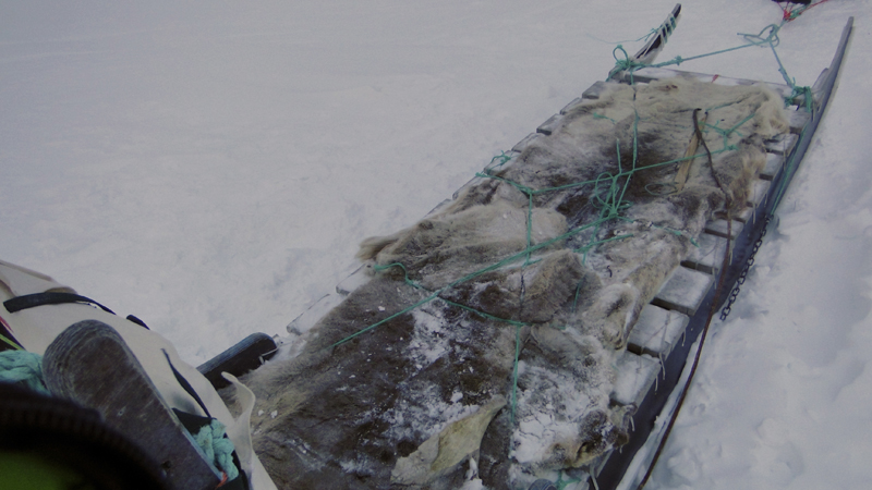 Hilary und Laura fahren mit einem Schlitten ich mit dem zweiten. Die Hunde, 10 vor meinem und 14 vor dem anderen sind kaum zu bremsen.